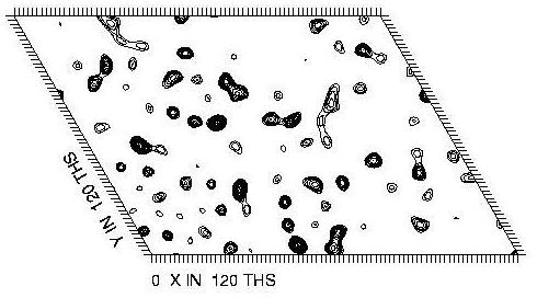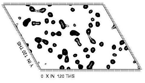 The output of the patterson_map.inp task file is a CNS binary map for each of the Harker sections. These Harker sections will be determined automatically by CNS, but are currently limited to those sections which are parallel to unit cell axes (diagonal sections will not be written). The Harker sections can be converted to a Postscript image using the command plot_patterson. This takes interactive input from the terminal:
