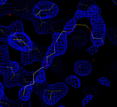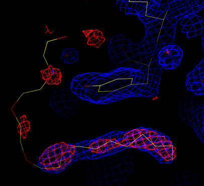 | Cross-validated Sigma-A weighted 2Fo-Fc map in blue (at 1.5 sigma). Gradient map in red (3 sigma). The coordinates for the wild-type structure (1prn) are shown. Density is seen for a lipid/detergent molecule (also seen in 7prn). |