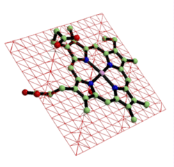 A best-fit plane through all the atoms of the heme in 1eca. The equation of the plane was computed by program PRINCIP, its surface generated by SURFNET, and is rendered here by Raster3D.