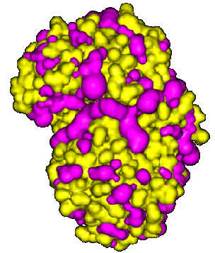 The plot below shows the gap-regions in the aspartic protease endothiapepsin from the PDB file 3er5. The surface of the protein is shown in yellow while all its clefts and cavities are depicted in lilac. The plot was produced using the solid rendering of InsightII.