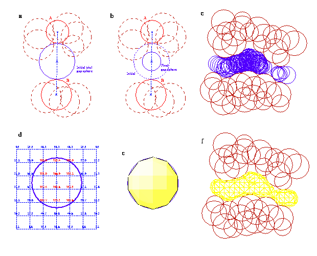 f. When all the spheres have updated the grid, the final 3D contour represents the surface of the interpenetrating gap spheres, and hence defines the extent of the gap region between the two molecules.